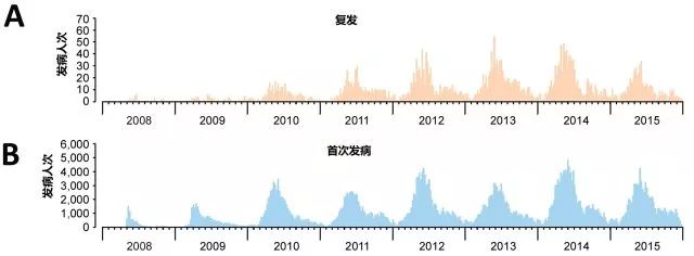 來自29個省份的數(shù)據(jù)表明,2008-2015年間共計12,256,102人次手足口病例上報至國家疾病預防和控制中心。如圖1所示,復發(fā)性手足口病一年中有兩個高峰,分別是春末夏初(4-6月) 和秋季(9-10月)。
