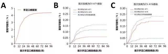 A)所有疑似和確診手足口病患者復發(fā)的可能性。B)首次感染為EV-A71病毒的患者再次感染的可能性。C) 首次感染為CV-A16病毒的患者再次感染的可能性。