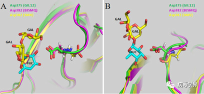3. 在暴發(fā)的中期,發(fā)現(xiàn)了一個(gè)GII.P16-GII.2變異株,其HBGA結(jié)合譜增加(圖3B)。進(jìn)一步序列分析顯示此變異株VP1蛋白相比于早期株發(fā)生了一個(gè)氨基酸突變Val256Ile,同時(shí)晶體結(jié)構(gòu)顯示該變異株中在HBGA受體結(jié)合區(qū)中起重要作用的Asp382發(fā)生了方向改變,更傾向于受體結(jié)合區(qū)域(圖5)。Asp382方向改變和Val256Ile突變很可能是導(dǎo)致該變異株HBGA受體結(jié)合譜增加的原因。