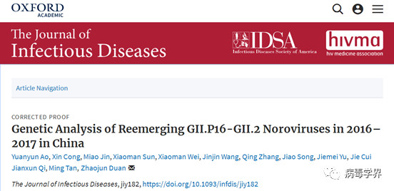 1. Ao Y, Cong X, Jin M, ?Sun X, Wei X, Wang J,Zhang Q, Song J, Yu J, Cui J, Qi J, Tan M, Duan Z. Genetic Analysis of Re-Emerging GII.P16-GII.2 Noroviruses in 2016-2017 in China. J Infect Dis.2018 Mar 29.?