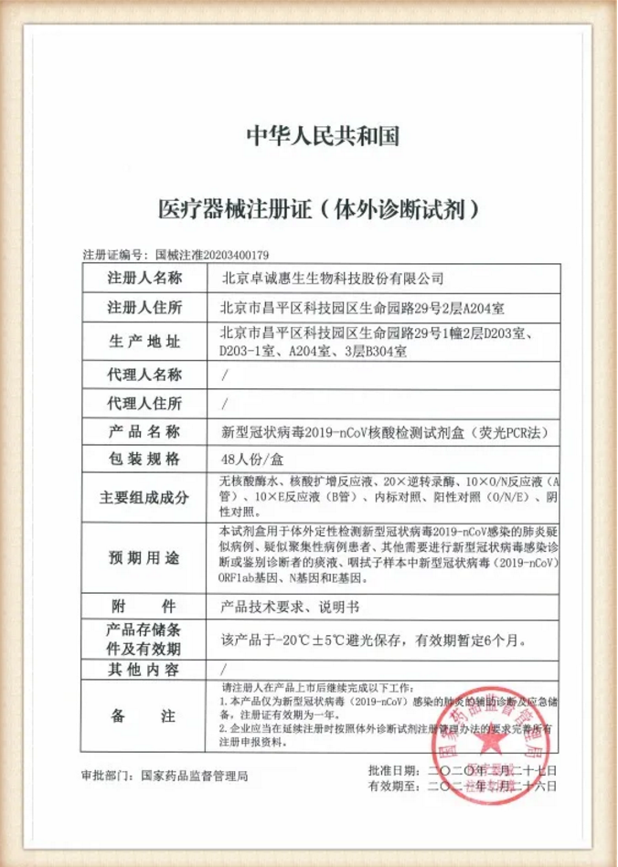 好消息!北京卓誠惠生新型冠狀病毒核酸檢測試劑獲得醫(yī)療器械注冊證!
