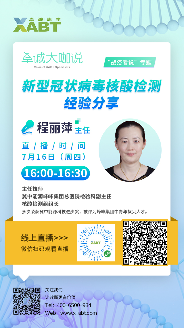 卓誠(chéng)大咖說(shuō)之“戰(zhàn)疫者說(shuō)”專題第三期將于7月16日16:00正式開(kāi)播,我們非常榮幸邀請(qǐng)到冀中能源峰峰集團(tuán)總醫(yī)院檢驗(yàn)科程麗萍主任為我們帶來(lái)《新型冠狀病毒核酸檢測(cè)的經(jīng)驗(yàn)分享》的主題講座,期待各位屆時(shí)蒞臨直播間,共同學(xué)習(xí),互相啟發(fā)!