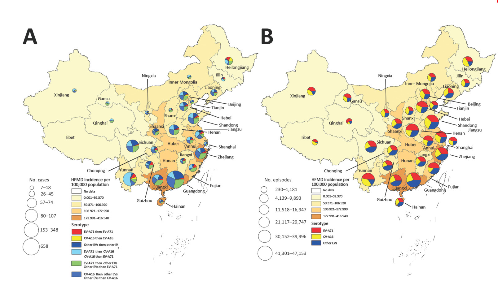 圖2. 復發(fā)性手足口?。ˋ)病例和腸道病毒感染(B)的地理分布圖(點擊可放大)