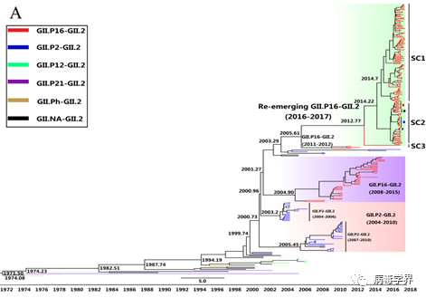 016至2017年,另一種以前較少發(fā)現(xiàn)的諾如病毒GII.P16-GII.2突然代替了先前流行GII.4和GII.17,成為了我國(guó)胃腸炎暴發(fā)疫情中的主要致病病原。同時(shí),中國(guó)香港和臺(tái)灣、日本、德國(guó)、法國(guó)、意大利、澳大利亞和美國(guó)等地相繼報(bào)道了該型諾如病毒引起的暴發(fā)疫情,提示該病毒已經(jīng)在世界范圍內(nèi)快速傳播流行。但是該病毒的起源、傳播、進(jìn)化動(dòng)力學(xué)及引起暴發(fā)流行分子機(jī)制目前還不清楚。